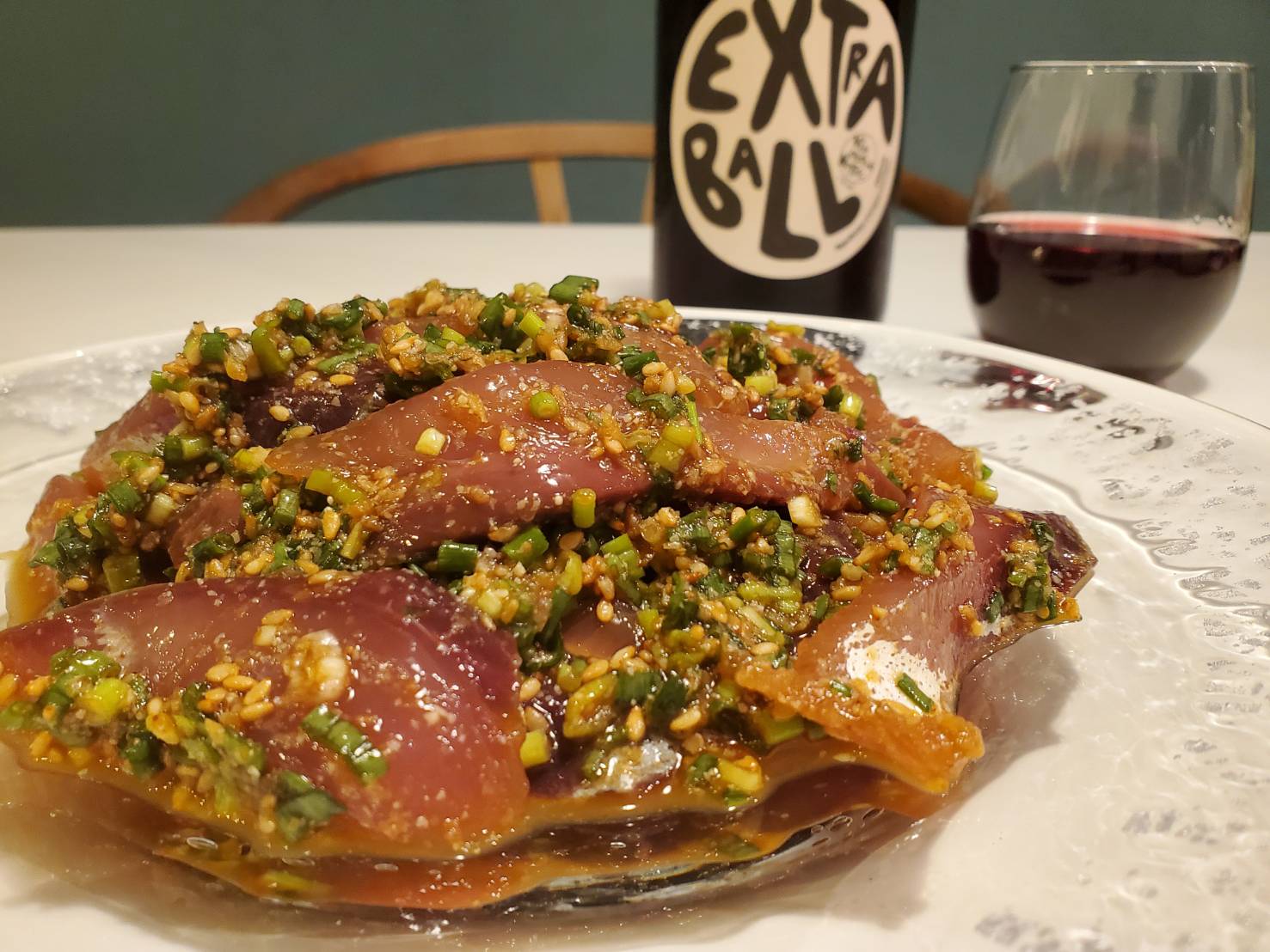 シノンはフランス・ロワール地方でカベルネ・フラン種から造られる赤ワインです。赤ワインですが少し冷えた方(13℃くらい)が美味しいです。 エクストラ・ボールはヴァン・ナチュールで、アルコール11.5%と軽めのスタイルですが赤い果実の上質なコクがあります。さらには爽やかなハーブのニュアンスとフレッシュでフルーティーな酸味が食欲を刺激する赤ワインです。 皮や種を早めにタンクから出して造ります。そのため渋みが少なくフルーティな果実味が美味しい、華やかで鮮やかな味わいに仕上がっていると思います。 【ペアリングするおすすめ料理は『りゅうきゅう』です】 大分県の郷土料理「りゅうきゅう」をイナダで造りました。イナダには渋みが少なくフルーティな酸味を持つ赤ワインが合います。 ワインの瑞々しく爽やかな酸味、特に赤ワインの酸味はフレッシュですがマイルドで、醤油の浸み込んだイナダの美味しい味わいと心地よく重なります。軽めで鮮やかなカベルネ・フランのワインは万能ねぎ、小ねぎと爽やかな風味にも合うし、甘みのある醤油との相性も申し分ありません。 根拠はありません。僕の経験からですがナチュラルワインと擦り胡麻の風味って、とても良く合います。 エクストラ・ボールのヴァン・ナチュールのスタイル、爽やかな香りやフルーティーな味わいが『りゅうきゅう』の美味しさをMAXに高めてくれました。 りゅうきゅうのレシピ記事(※こちらから)